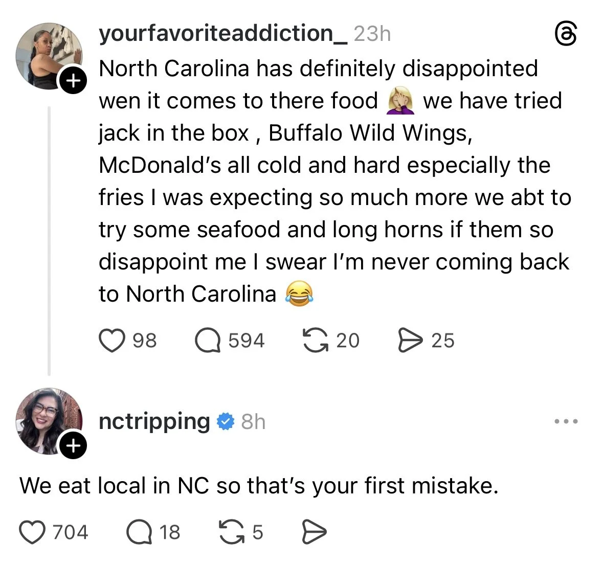When I came across this thread, it got a proper guffaw out of me. The idea of someone critiquing the national fast food chains of a state they’re visiting is so ridiculous. I mean, if they’re going to critique local chains like Cookout or Bojangles, that would be one thing. But this has to be one of the dumbest food-related takes I’ve ever seen.